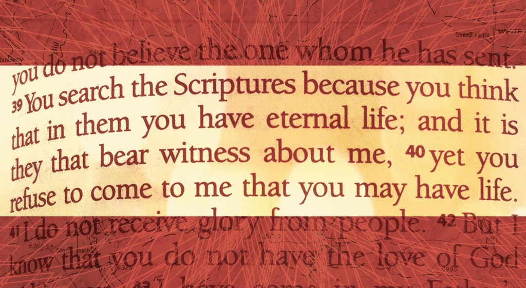 John 5:39-40 You have your heads in your Bibles constantly because you think you’ll find eternal life there. But you miss the forest for the trees. These Scriptures are all about me! And here I am…standing right before you…and you aren’t willing to receive from me the life you say you want.